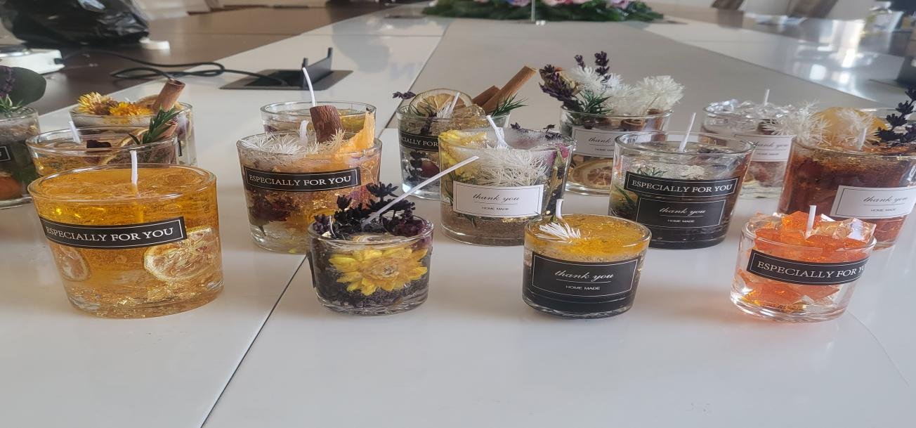 大家充分發(fā)揮創(chuàng)造力,經(jīng)過近一個(gè)小時(shí)的精心制作,一份份獨(dú)特的、充滿創(chuàng)意的香薰蠟燭完美的展現(xiàn)在我們面前。作品中香薰造型各異,也代表著大家不同的心境與體驗(yàn),鮮亮的橙色、清新的綠色、淡雅的白色,花立于杯中,或安靜或?yàn)⒚?,給人以美的享受。